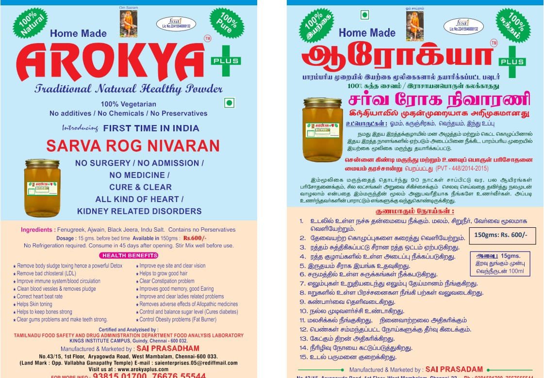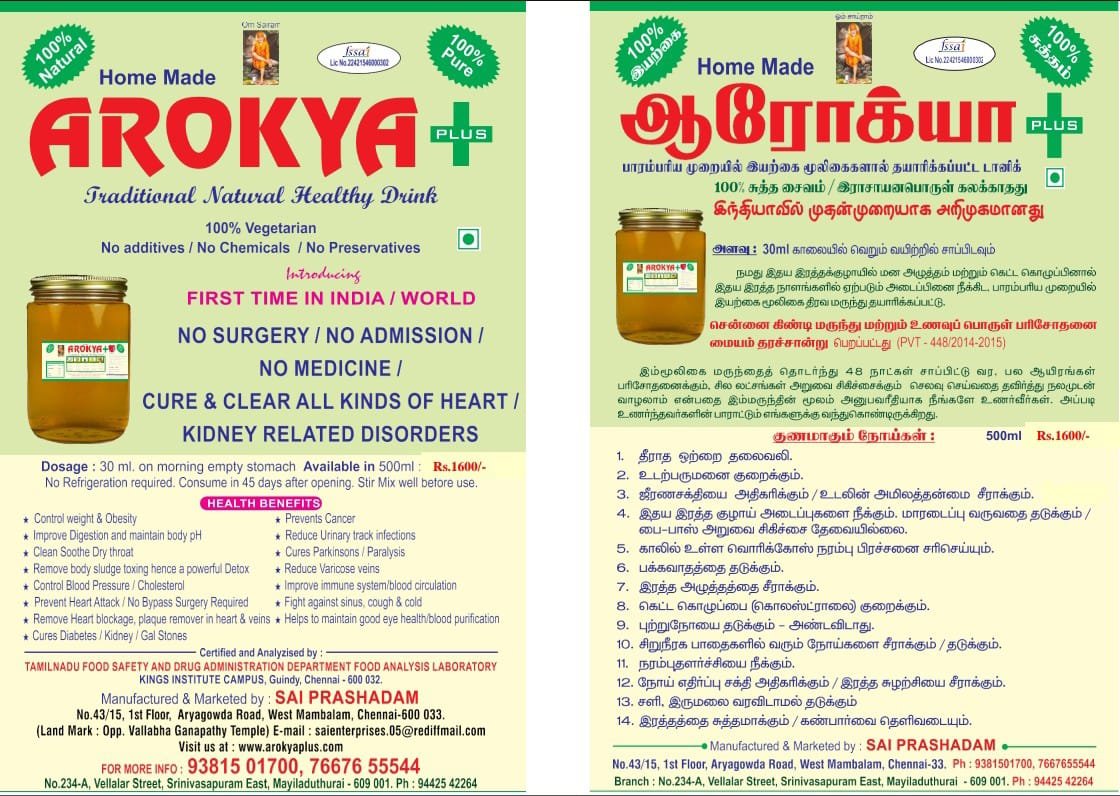 AROKYA PLUS Traditional healthy natural drink is tested certified and Analysed by TAMIL NADU FOOD SAFETY AND DRUG ADMINISTRATION DEPARTMENT FOOD ANALYSIS LABORATORY ONE OF THE LEADING LABS IN INDIA FROM KINGS INSTITUTE GUINDY CHENNAI, SAME BEEN approved by FSSAI ( food safety standard authority of India. AROKYA PLUS Traditional healthy natural drink one of the most trusted traditional natural drink with no side effects. AROKYA PLUS the name is known for its dedication towards the tenets of authentic natural herbs adapting the concept of ancient natural health drink for today's lifestyle , Years of research undertaken by our old ancestral and our senior citizen. AROKYA PLUS Traditional healthy natural drink is a complete relief from all sorts of stress related, morning waking up refreshed feeling energetic throughout the day getting relief from all kind of chorine disorders. Now it's a great new we are announcing that in india leading doctors started recommending and prescribing AROKYA PLUS Traditional healthy natural drink for today's lifestyle sane making AROKYA PLUS Traditional healthy natural drink as a mass reach across world.
